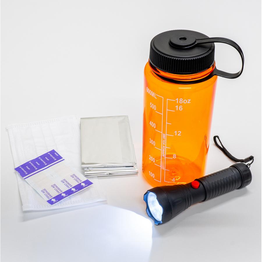 ■セット内容:ウォーターボトル(満水容量690ml)、懐中電灯、防寒用アルミシート、マスク、救急絆創膏2枚