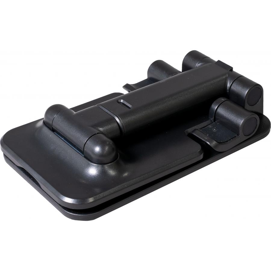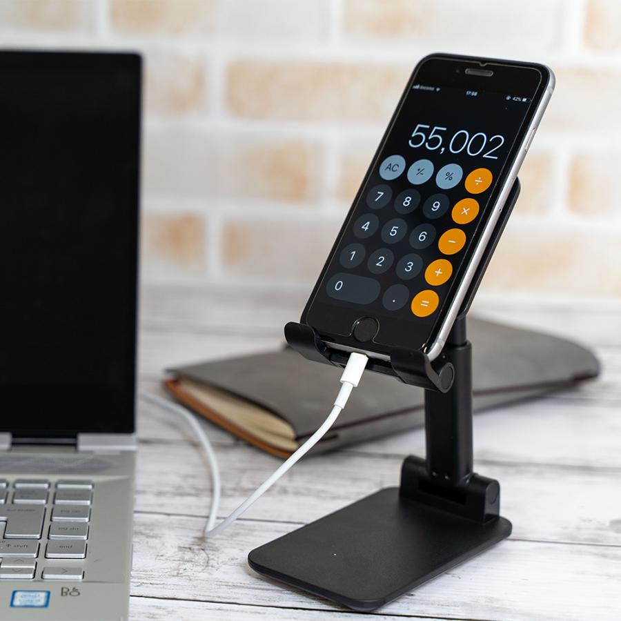 USBコードを差したままでも端末を置くことができ、リモート会議等にも使いやすい仕様です。また、コンパクトにたたむことで携帯しやすくなります。