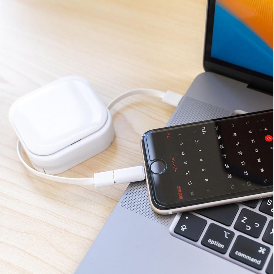 外出先でもスマートに対応できる、コンパクトで多機能なリール式スマホ充電ケーブル。プラグはUSB Type-Cを標準装備し、カバーを開ければUSB Type-AとiPhone対応のアタッチメントも付属。1本で複数の端末に対応できるため、モバイル機器が混在する現代にぴったりのアイテムです。さらにSIMピンも付いており、空きスペースにはSIMカードの収納も可能。旅行や出張時のSIM入れ替えもスムーズです。底面のパーツを引き出せばスマホスタンドとしても使うことができ、携帯性・機能性・利便性を兼ね備えた実用性抜群のアイテムです。