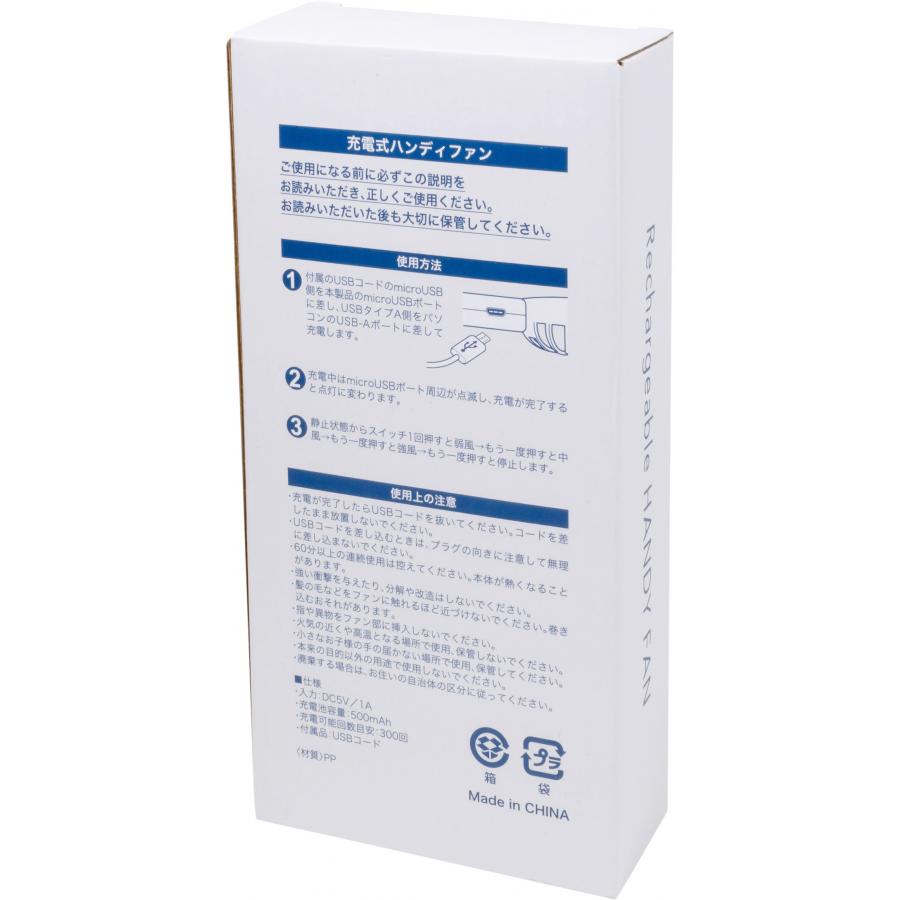 | 印刷範囲(印刷方法) | 1~2色/ハンドル正面:W20×H40mm(パッド印刷) 1~2色/ファン部中央:φ20mm(パッド印刷) |