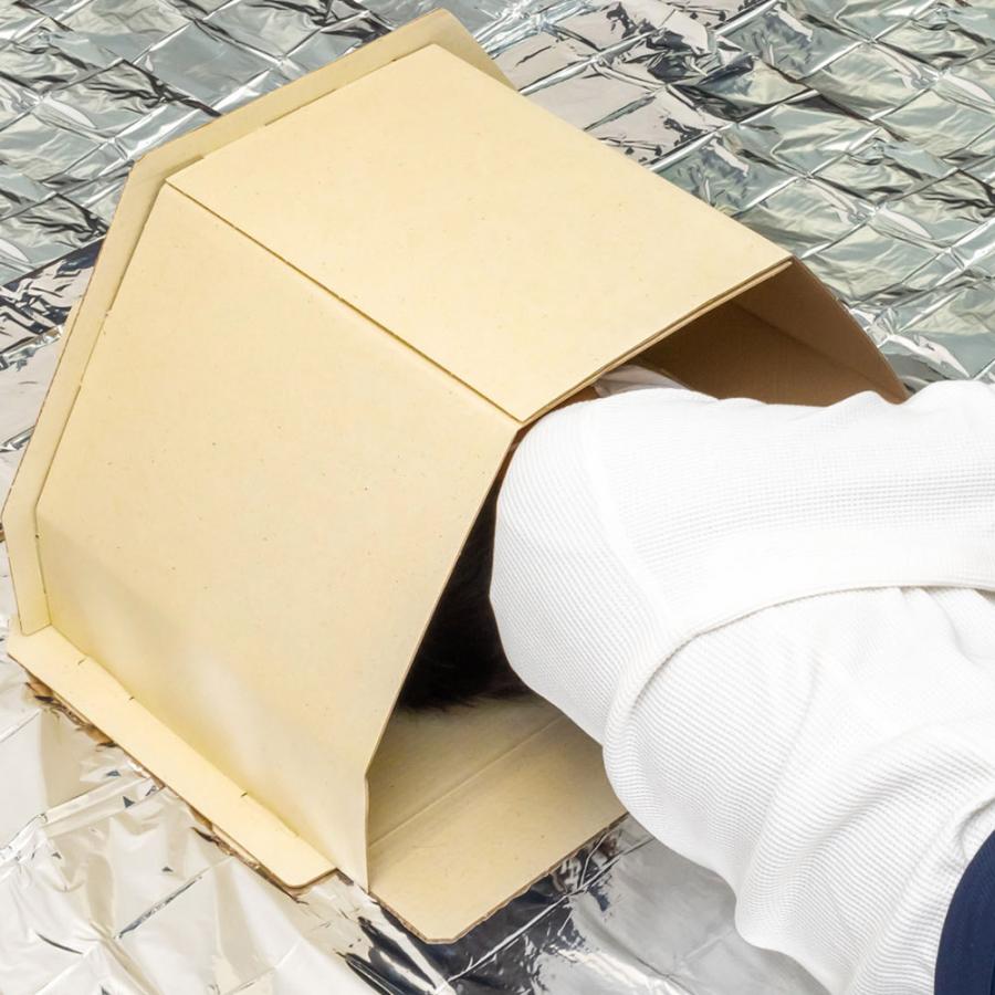 避難先での睡眠時に頭部を覆うことで、光や音を軽減し睡眠の質を向上できる組立式の防災安眠ドーム。独自にデザインした家型のフォルムを採用することにより、圧迫感を軽減しながら独立した空間を確保し、避難所でのストレス軽減にも役立ちます。