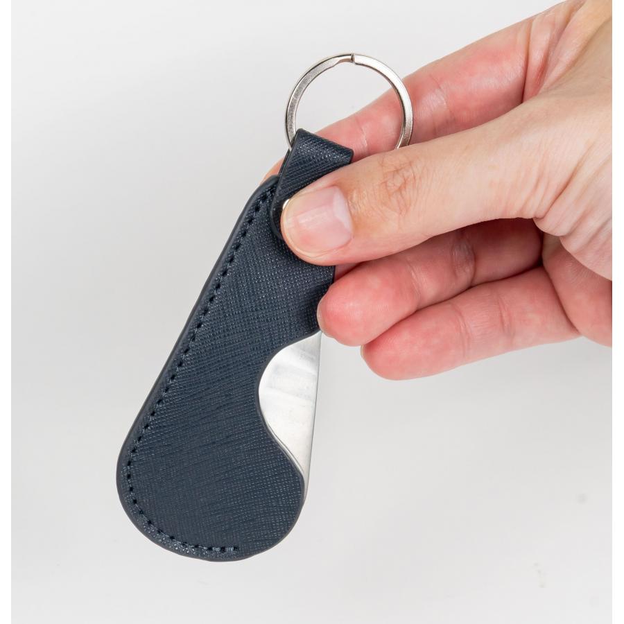 皮革製品製造時に出る未利用端材などを再加工して製品化したスタイリッシュな携帯用靴べら。高級感のある仕上がりで、ビジネスパーソンや身だしなみに気を遣う大人にぴったりのアイテムです。リング付きでキーホルダーとしても使える実用性が魅力。展示会や企業イベント、周年記念など、上質な印象を残したいシーンでのノベルティに最適です。コンパクトで携帯性に優れており、バッグやポーチに入れていつでもスマートに携帯できます。