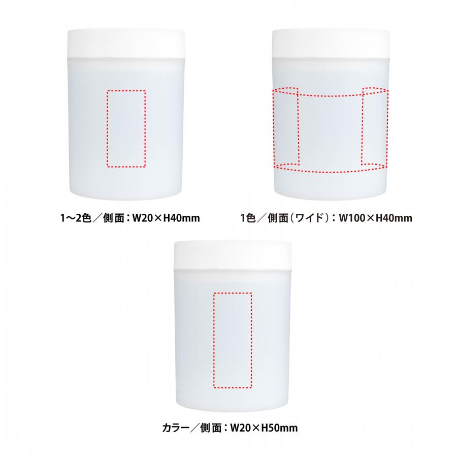 | 印刷範囲(印刷方法) | 1~2色/側面:W20×H40mm(パッド印刷) 1色/側面(ワイド):W100×H40mm(回転シルク印刷) カラー/側面:W20×H50mm(インクジェット印刷) |